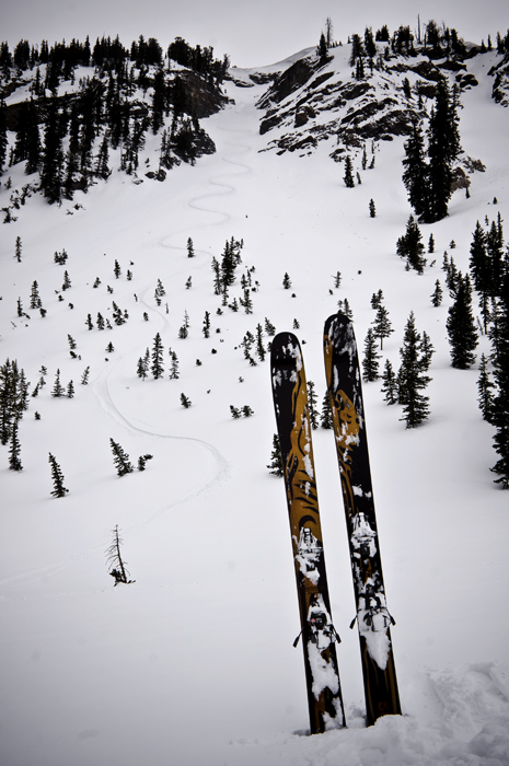 4/2/2012 – After saving for most of the winter and a couple of boot sizing issues, I finally got my new touring setup mounted and ready for shredding. The setup is: Skilogik Howitzer 186s with Dynafit TLT Vertical ST bindings, Dynafit ZZero TC4 boots, and my beloved BCA magic carpet skins! Being that the skis are called “Howitzers,” I assume they are meant to bomb lines like no other ski, and therefore I only plan on allowing the ski to do so. These couple of photos are from the Howitzers first day out, where they toured approximately 5k’ and pointed me into an excellent couple of Wasatch lines. The tour went as such: out the Highway to Heaven gate at Solitude, dug a pit and completed a full pit profile on it, skied East Bowl from Emma Ridge, skinned up West Bowl, dropped into the Shark’s Fin, skinned up Flagstaff, and finished by dropped into the Hallway Couloir. Finding the entrance to the Hallway Couloir, a Wasatch classic, was sketchy but the skiing easily made up for it with 75% of the turns being over knee deep! This new setup’s first day was an excellent start on its journey into Gnarnia, and my only complaint about the skis was that they had TOO sharp of edges! Enjoy the pics…