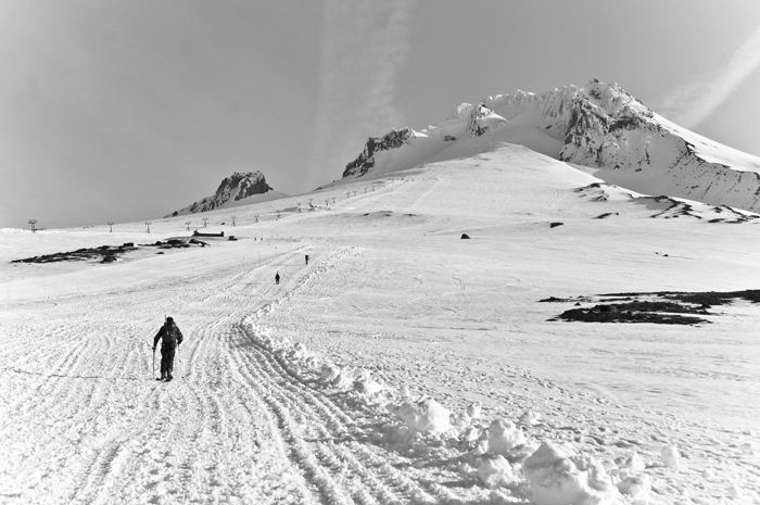 Leaving the car around 7:30am, the ascent was strait forward and efficient – knocking out the first 2,500′ to the top of Timberline in a quick hour and passing countless suffering mountaineers slogging their way towards the summit.