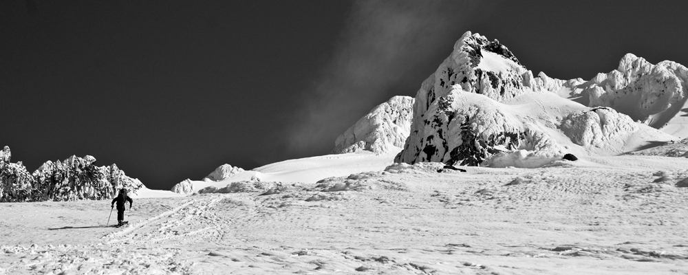 4/29/12 – After a solid week of schralping around the Cascades, Jonny and I set our sights at Mt. Hood to cap off the trip.  Although it’s dwarved by many of the Cascade volcanoes, the mighty Wyeast held a special spot in Jonny’s heart after skiing on her lower flanks all season long; slowly learning her soul and caressing her ridges for a later summiting.  Therefore, with a little dream team ambition, we had to gun for Mt. Hood.