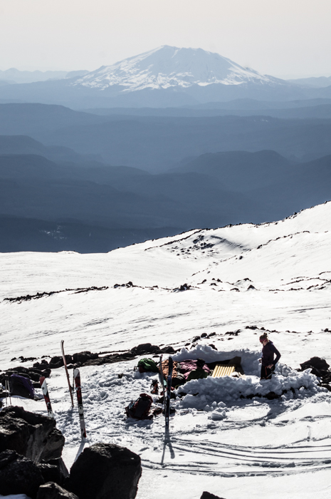 High Camp on Adams, With Mt. St. Helens Looming Behind