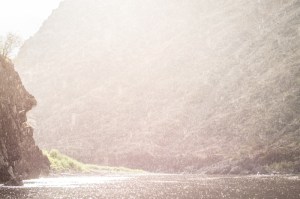 Alan and Lee Paddling Along as the Sun Breaks Through the Rain