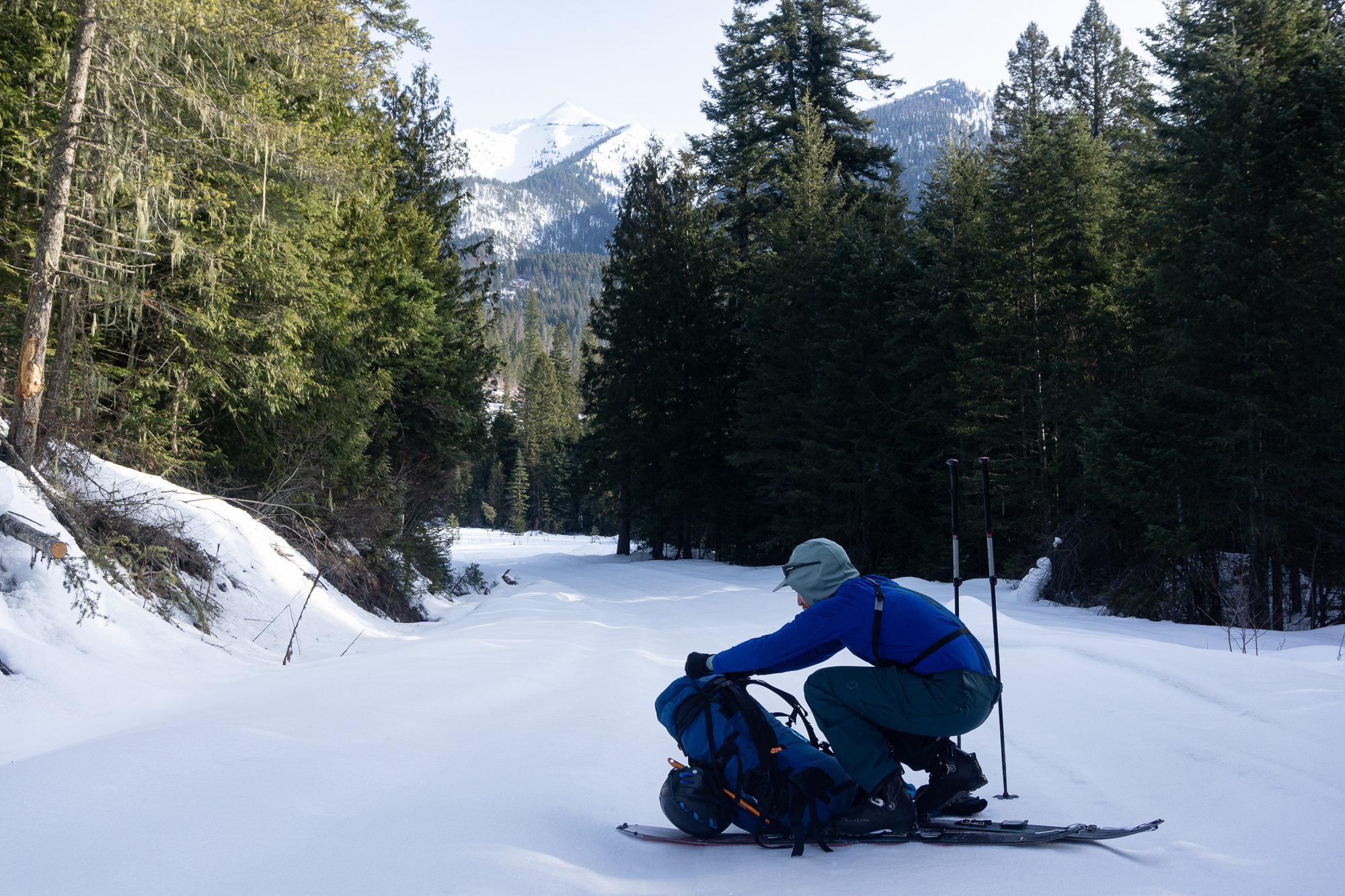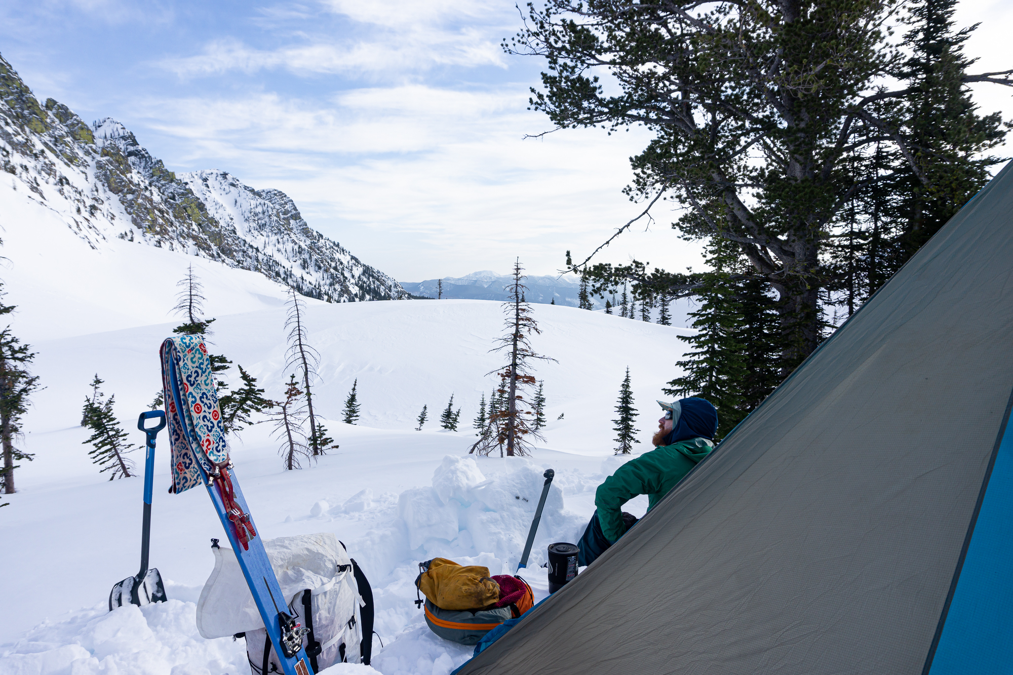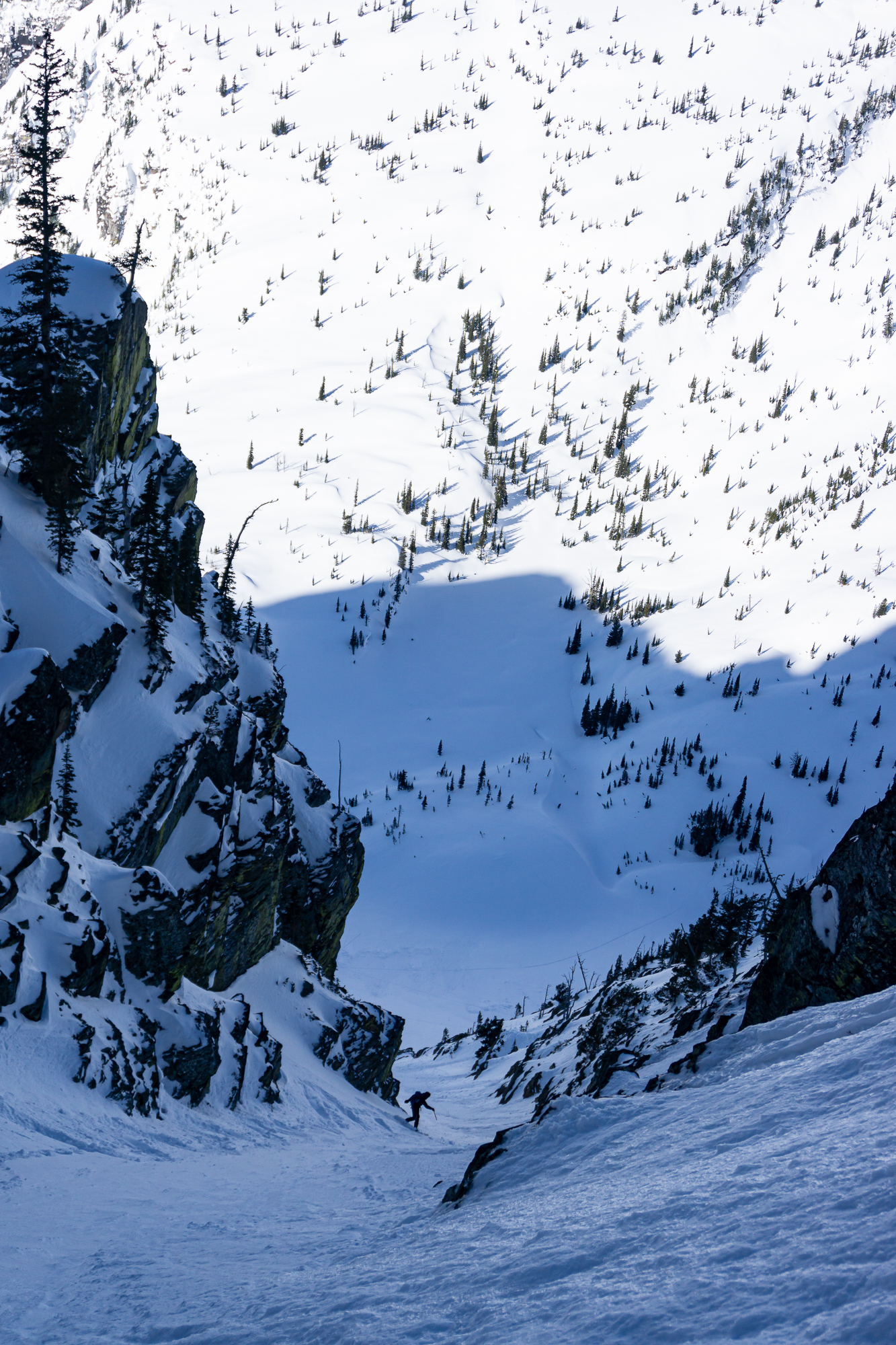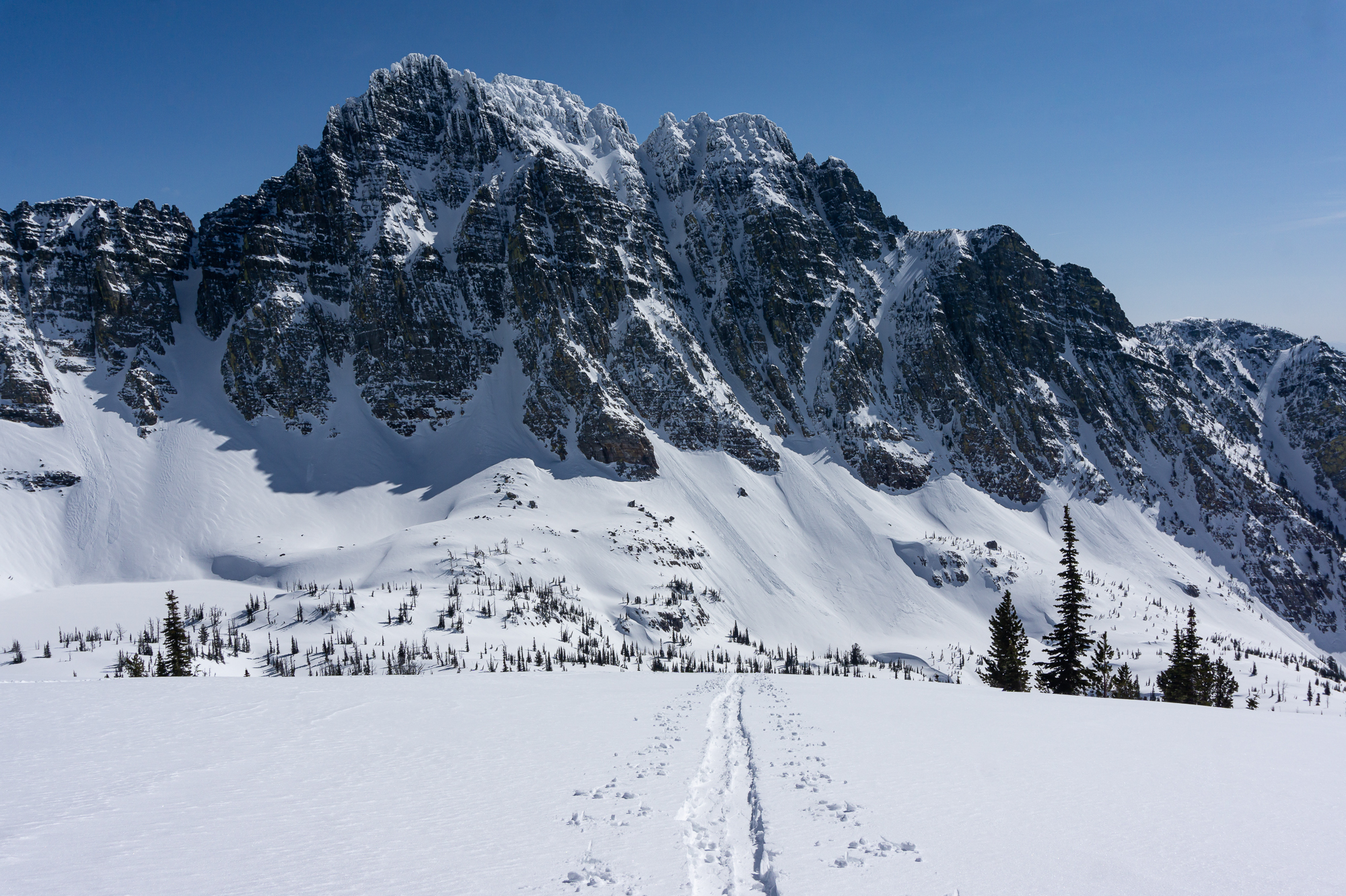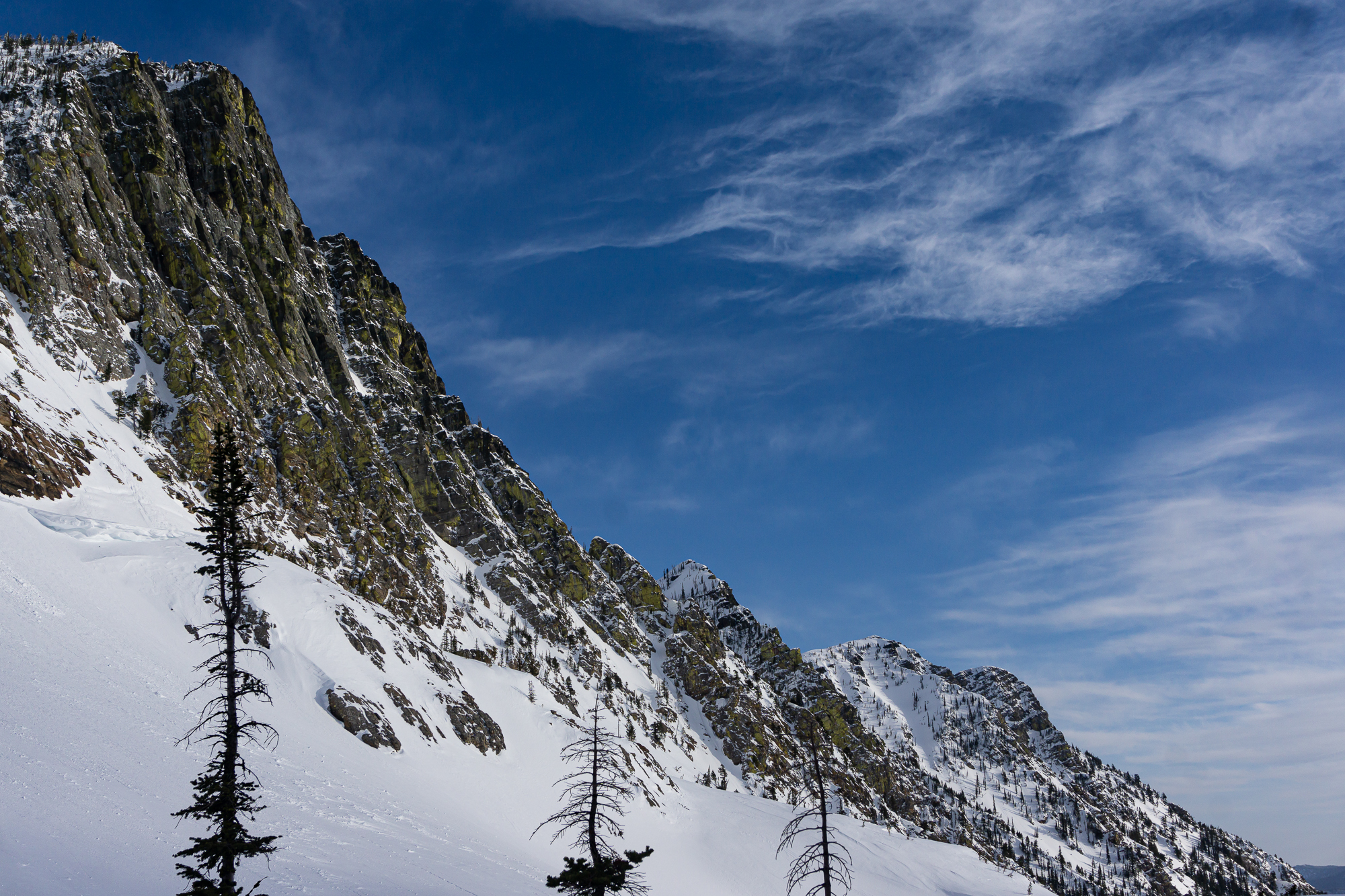 We met up the night before in St. Ignatius and car camped where the snow stopped us on the road to St. Mary reservoir. The next morning we donned packs and started the long walk up and in. There was decent low elevation snow coverage and the bushwhacking was light duty at its worst as we ascended the shoulder of East St. Mary peak. Carrying overnight packs made the climb a very solid effort and we thoroughly enjoyed the casual turns down towards No Fish Lake in the late afternoon. We set camp in a pocket of trees just outside of the apron of the couloir, basked in the alpine wonder of clear weather and thoroughly enjoyed each other’s company that evening.