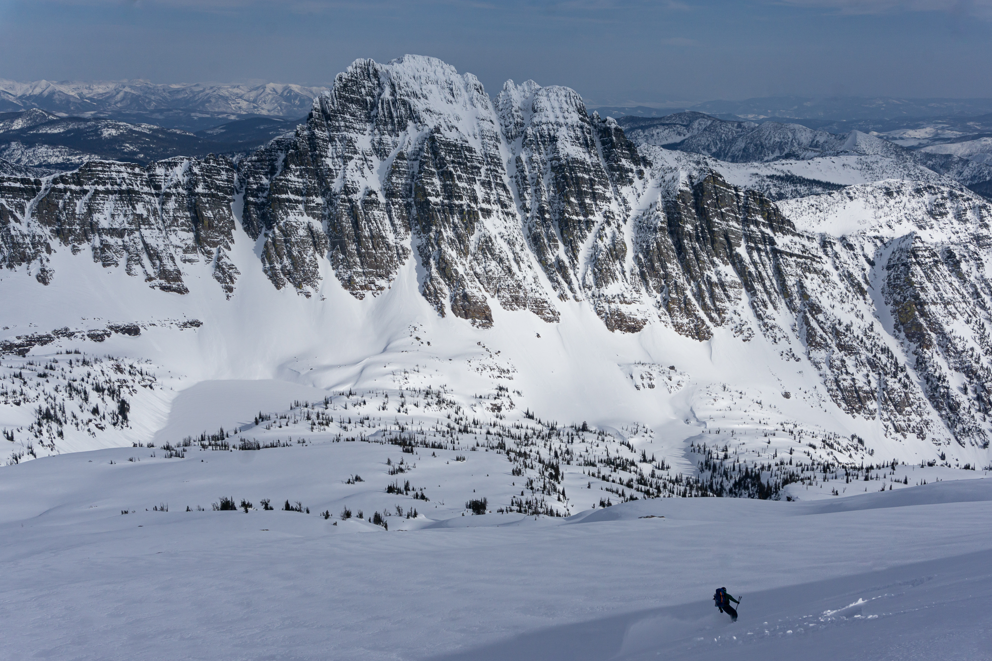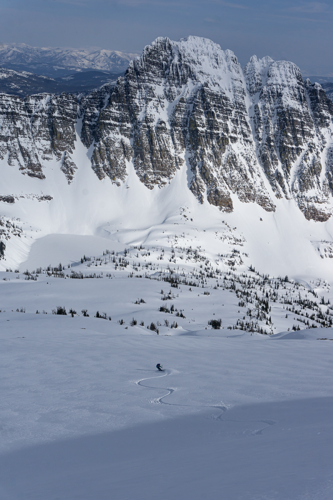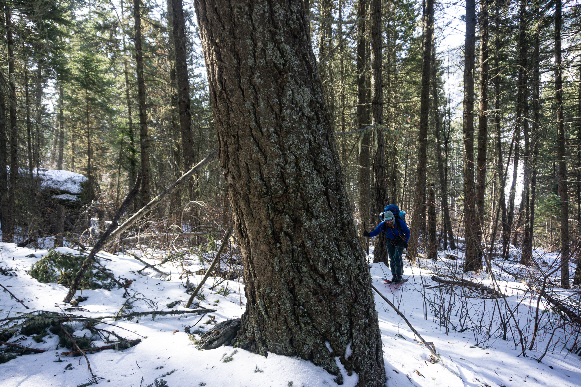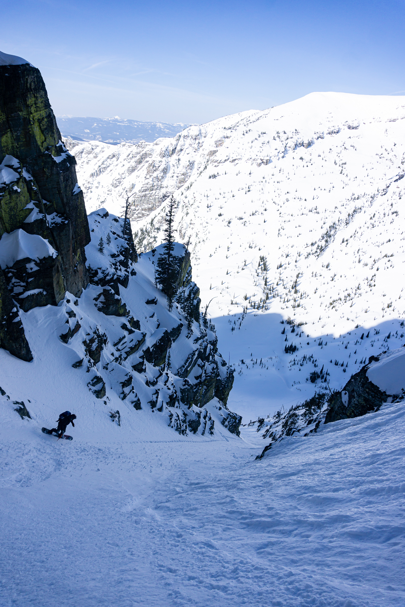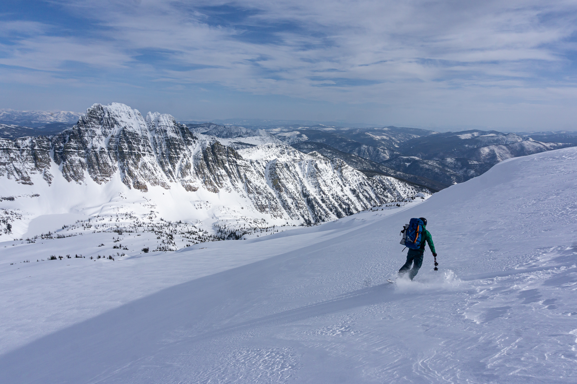 We met up the night before in St. Ignatius and car camped where the snow stopped us on the road to St. Mary reservoir. The next morning we donned packs and started the long walk up and in. There was decent low elevation snow coverage and the bushwhacking was light duty at its worst as we ascended the shoulder of East St. Mary peak. Carrying overnight packs made the climb a very solid effort and we thoroughly enjoyed the casual turns down towards No Fish Lake in the late afternoon. We set camp in a pocket of trees just outside of the apron of the couloir, basked in the alpine wonder of clear weather and thoroughly enjoyed each other’s company that evening.