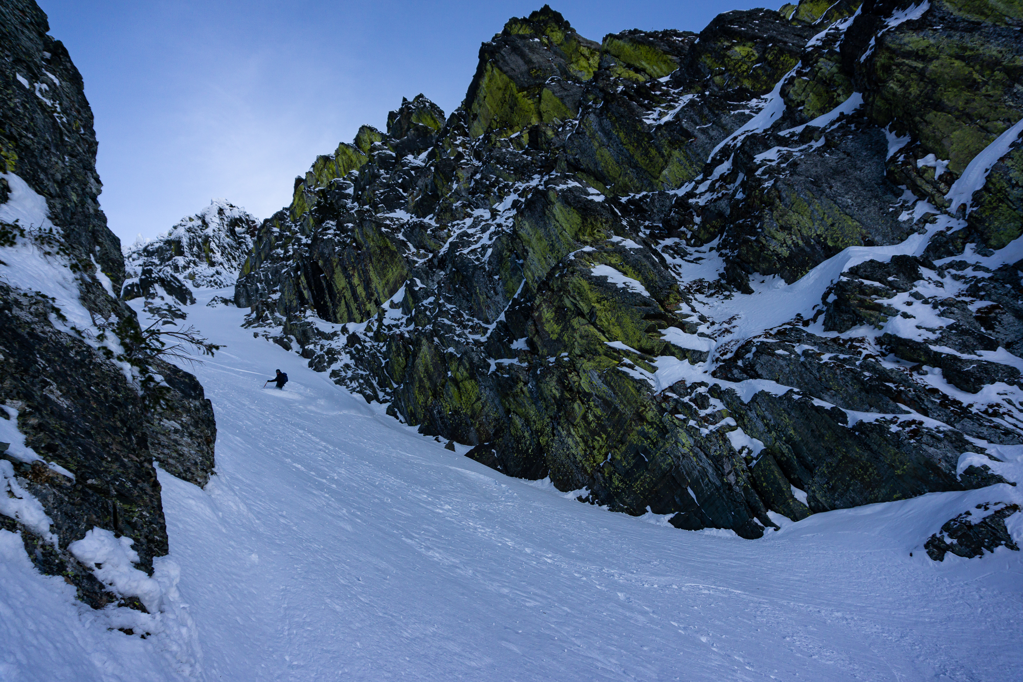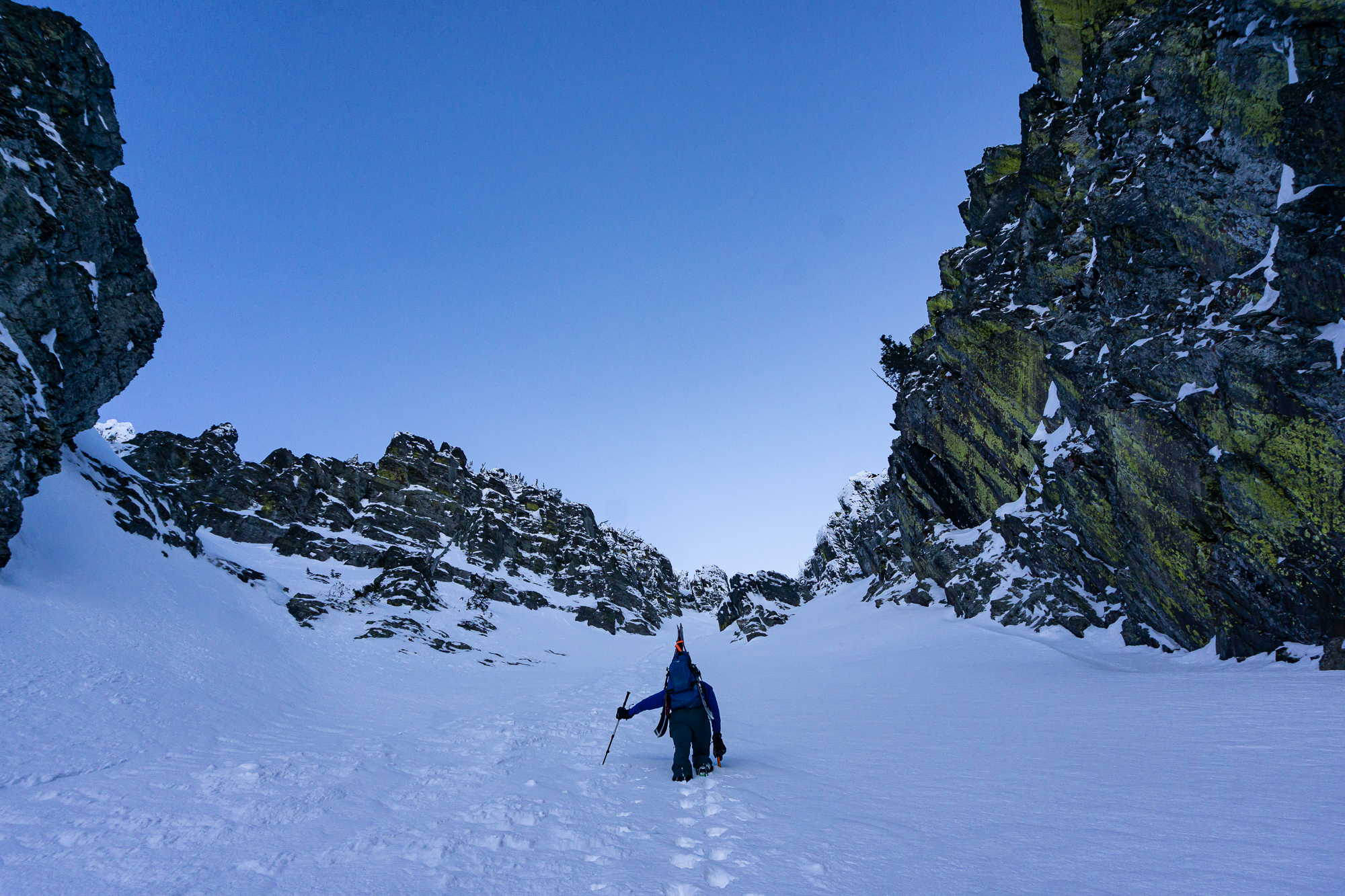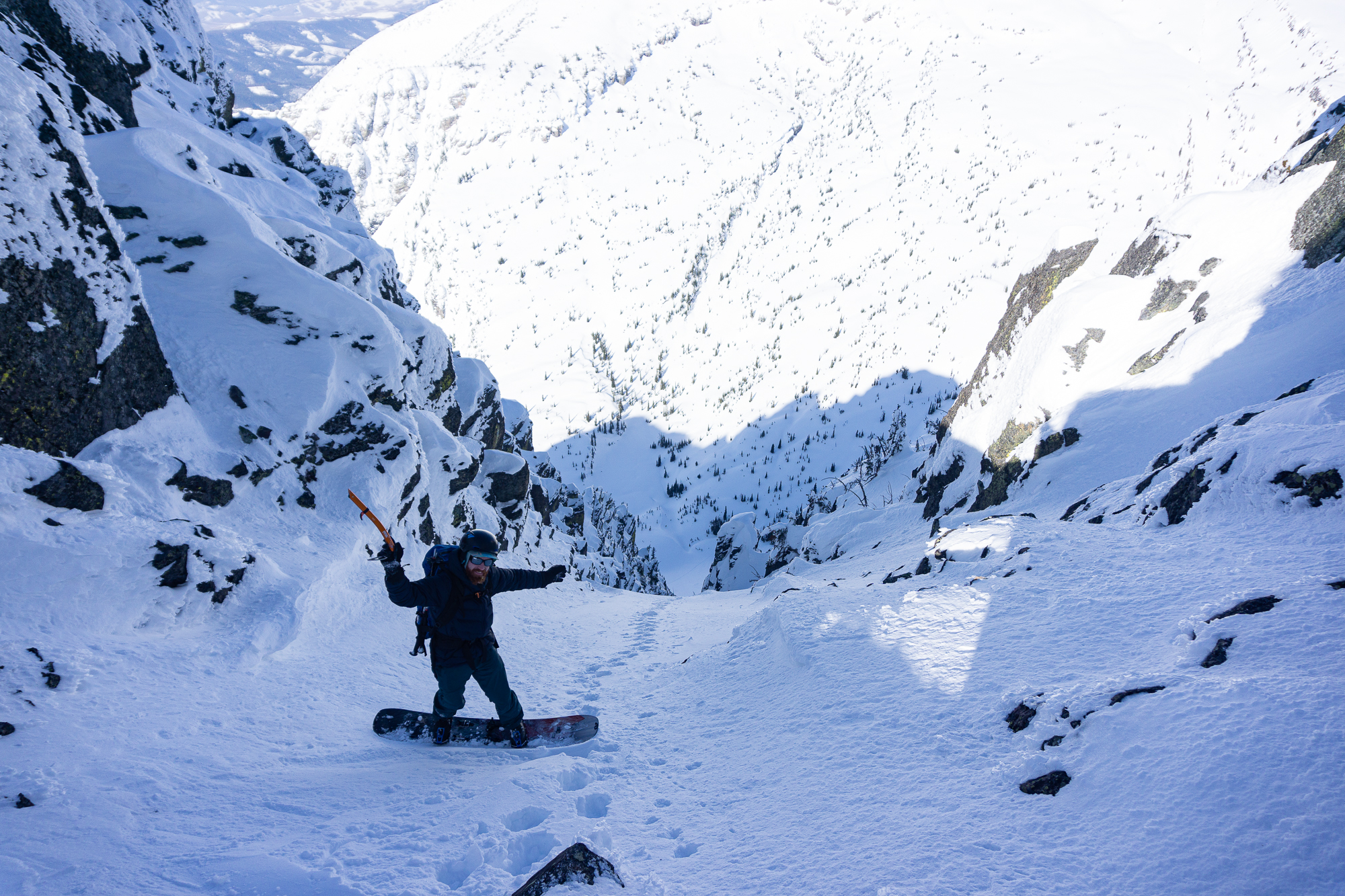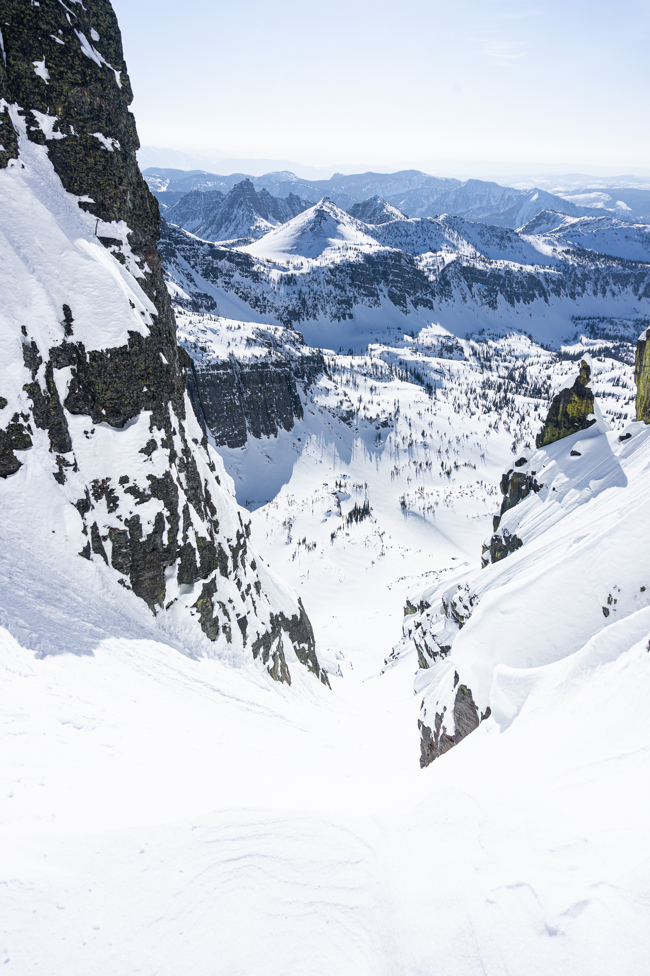 The next morning we were up and rolling early with the idea of a bonus ski of the connected backside (East) couloir powering us up the climb. We climbed fluidly together, as we have done since our first blind ski date a few years ago (thanks Justin!), and enjoyed the incredible position we found ourselves in while ascending. Upon topping out, it appeared that the sunshine was doing it’s best to shut down our bonus backside lap – so we called it and milked a casual transition to get into the best headspace for descent. Then we descended. And all was good and right in our little world of steep classic couloir skiing.