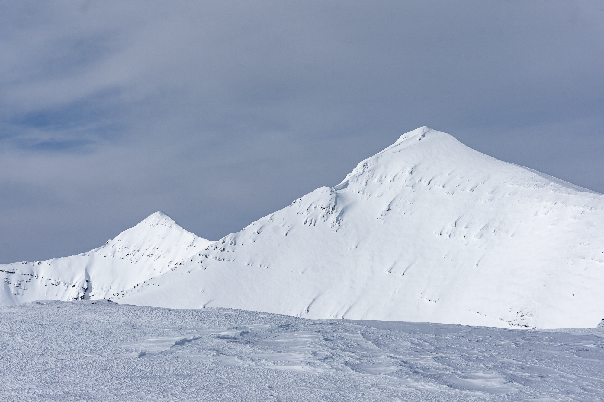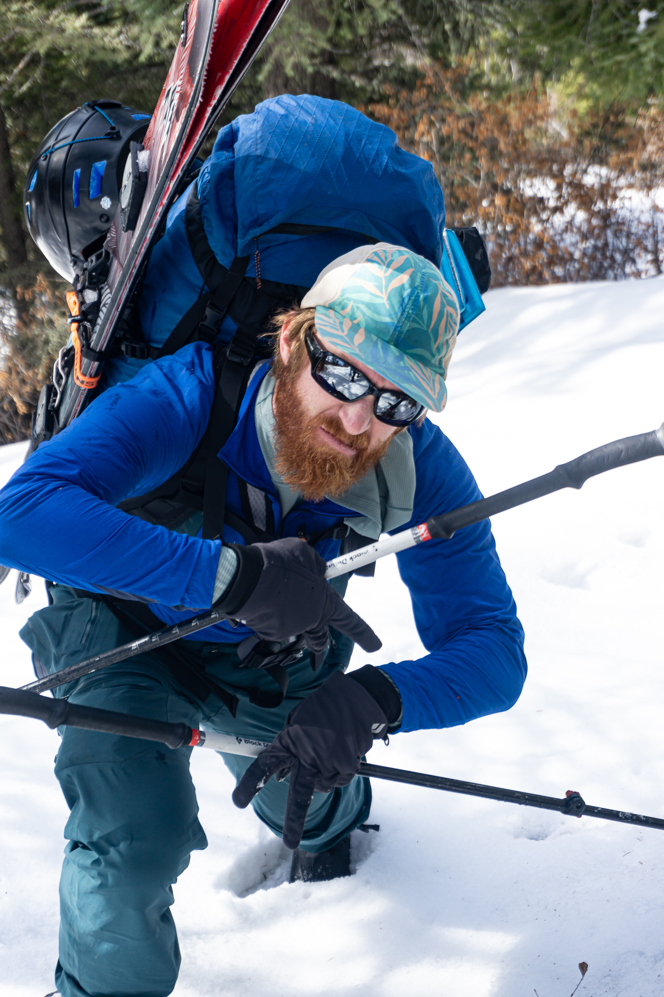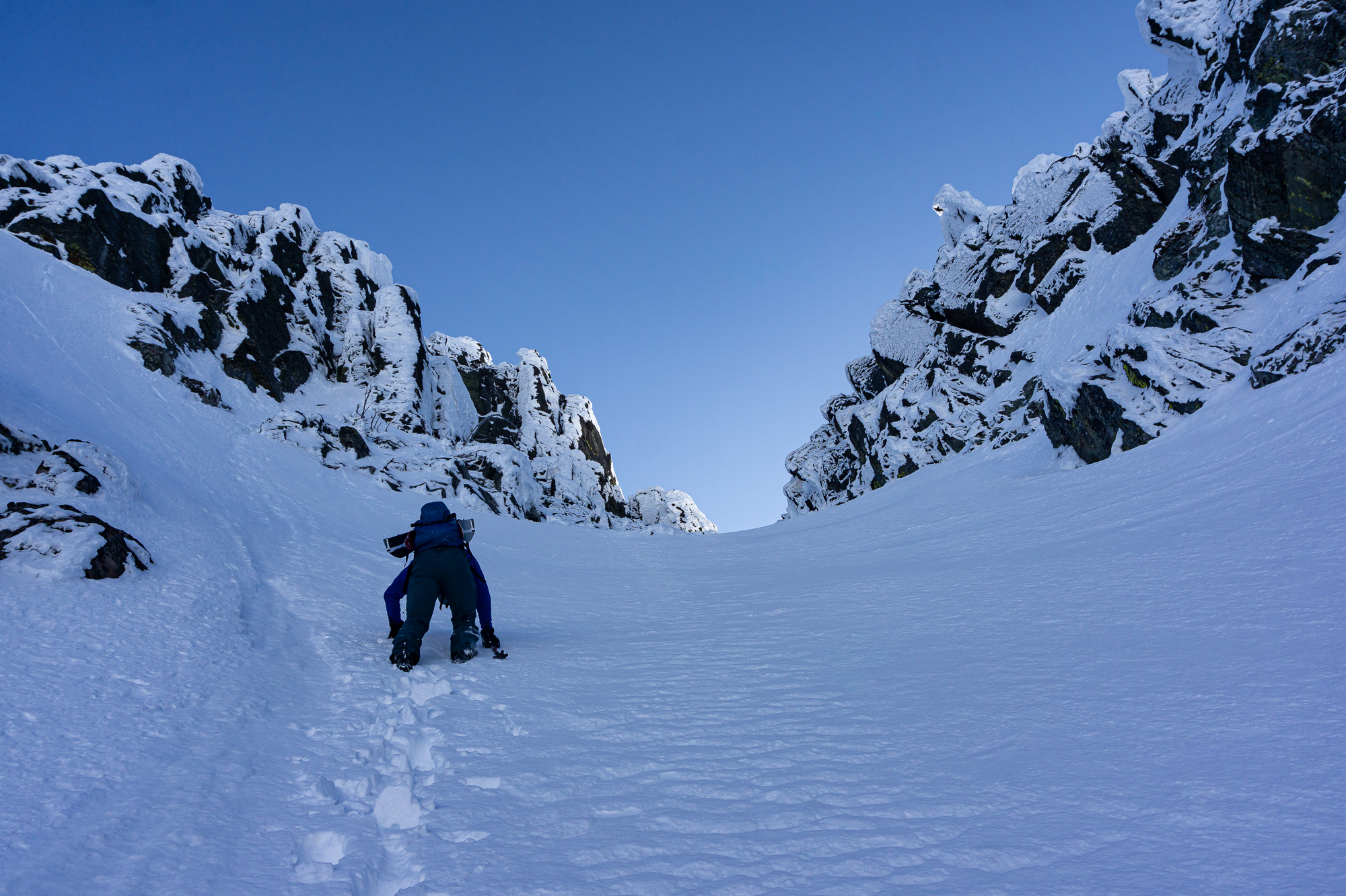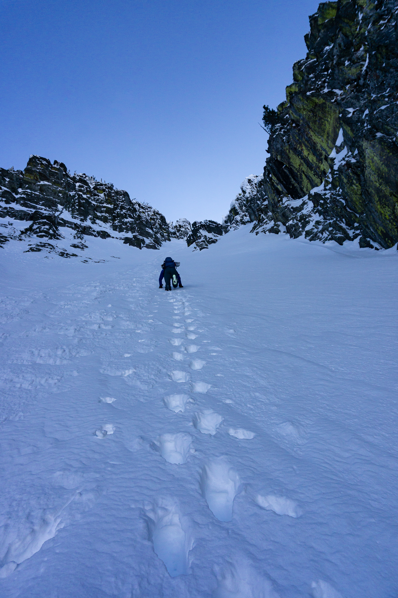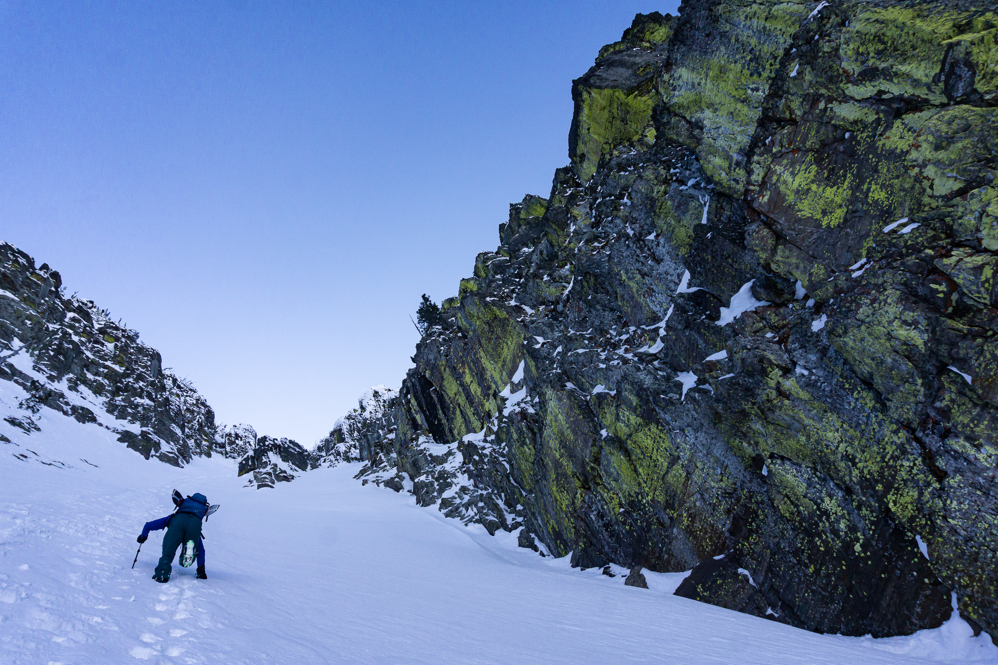The next morning we were up and rolling early with the idea of a bonus ski of the connected backside (East) couloir powering us up the climb. We climbed fluidly together, as we have done since our first blind ski date a few years ago (thanks Justin!), and enjoyed the incredible position we found ourselves in while ascending. Upon topping out, it appeared that the sunshine was doing it’s best to shut down our bonus backside lap – so we called it and milked a casual transition to get into the best headspace for descent. Then we descended. And all was good and right in our little world of steep classic couloir skiing.