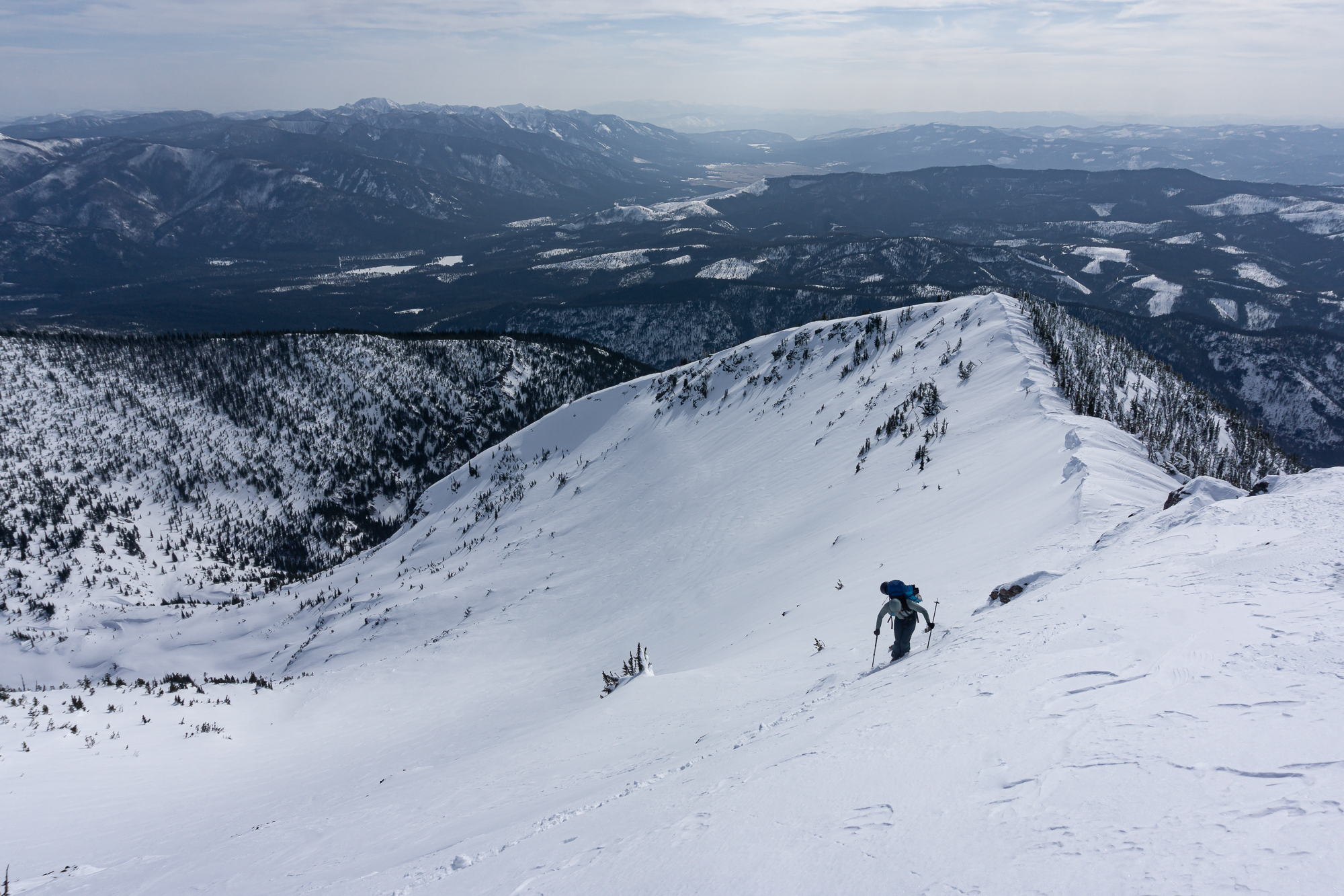 3/18 to 3/19/2023 – There are certain ski lines that linger in the back of your mind for a long while. This is one of those ski lines: Grey Wolf Peak’s West Couloir. This little beauty is a Western Montana classic that has been well publicized on the internet ever since RandoSteve posted up a trip report on his blog about it back in 2009, and yet is only skied by a handful of folks each season. This is probably due to the either monster day or classy yet honest overnight required to enjoy turns down this sliver of solitude. After years of not going for it and many discussions with close touring partners about the line, George and I decided to meet up and give it a whirl in mid-March during a weekend window of high pressure and stability.